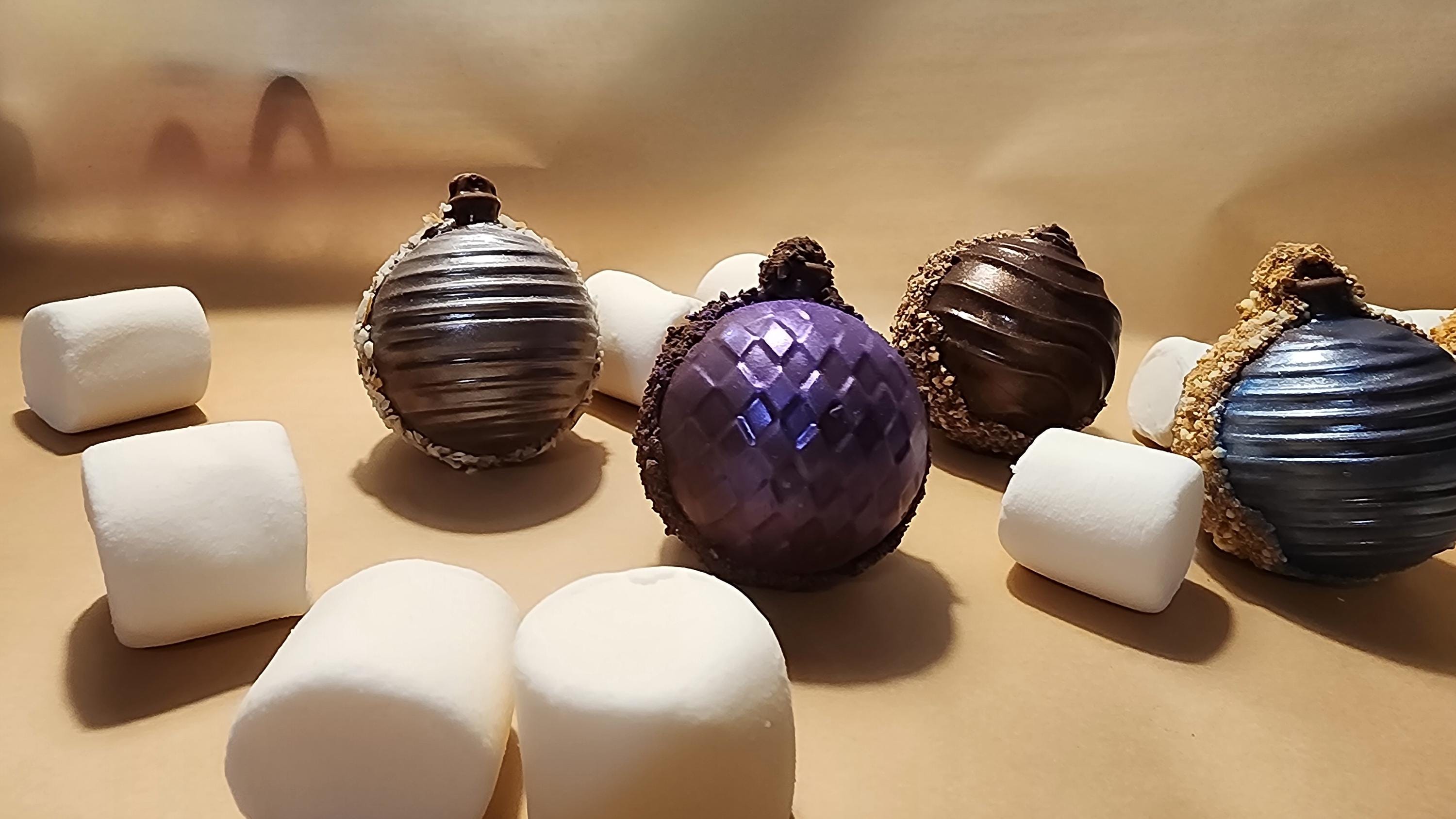 We keep our decorations simple so the flavors stand out. You'll find a light dusting of sea salt on our salted caramel, purple and gold sugar sand on our pumpkin spice, red sugar sand on white chocolate, and silver sugar sand on vanilla. Chocolate sprinkles decorate our rum balls while espresso and cocoa coat the outside of their namesake balls. Contents might include cocoa powder, flavored syrup, sea salt, vanilla bean powder, ground flavorings, and of course marshmallows!!! All meant to enhance your bombs flavor :)